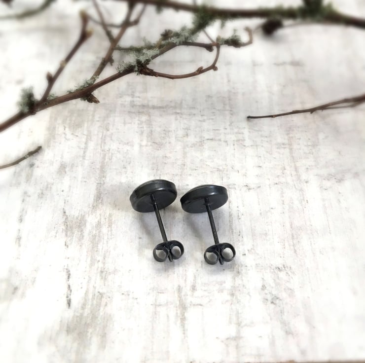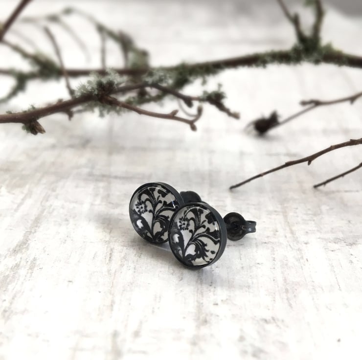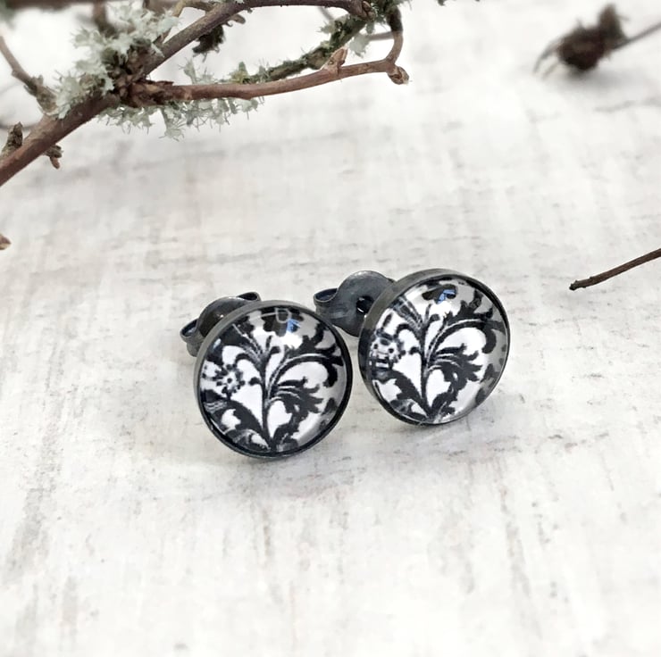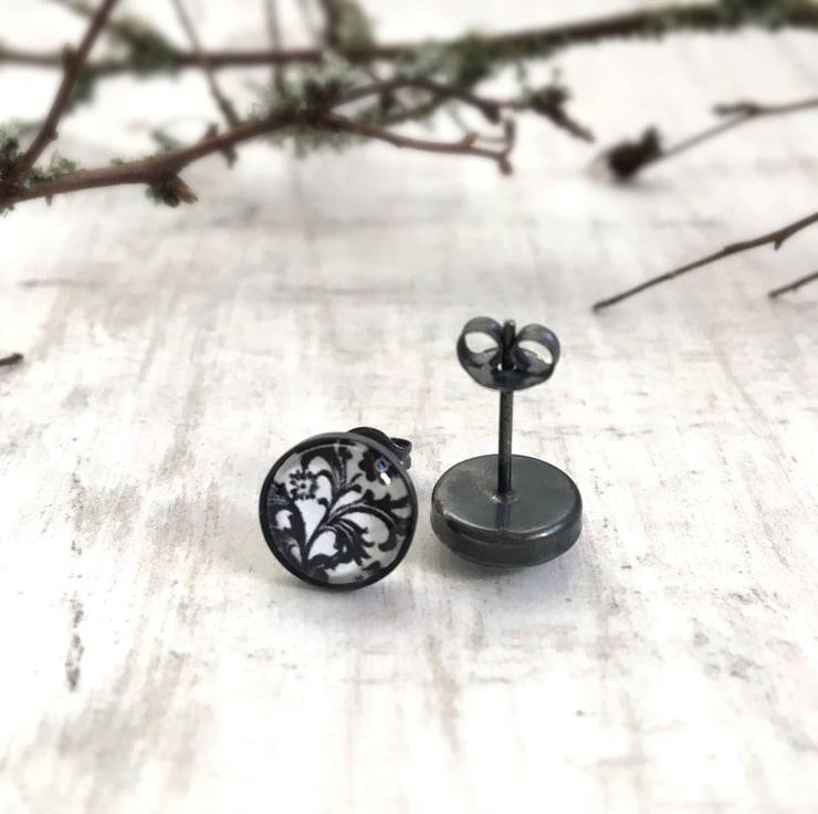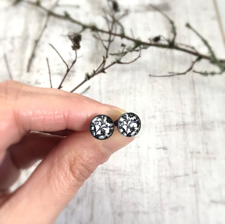 The studs are made from sterling silver and oxidised to blacken the metal. They feature a print of my floral design that is sealed underneath a glass cabochon and set into the stud. Supplied with butterfly backs.
