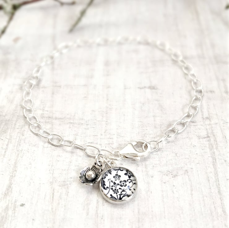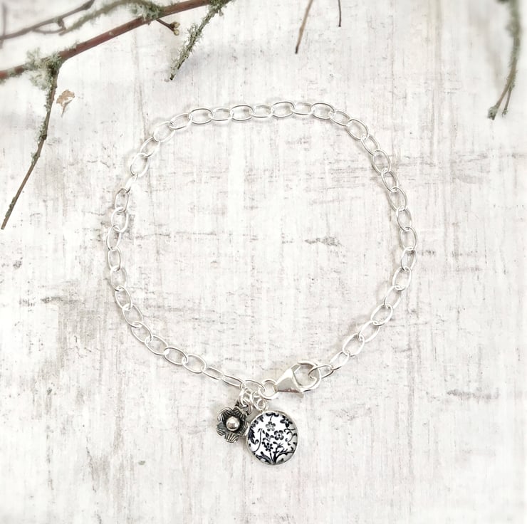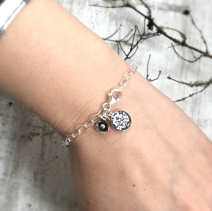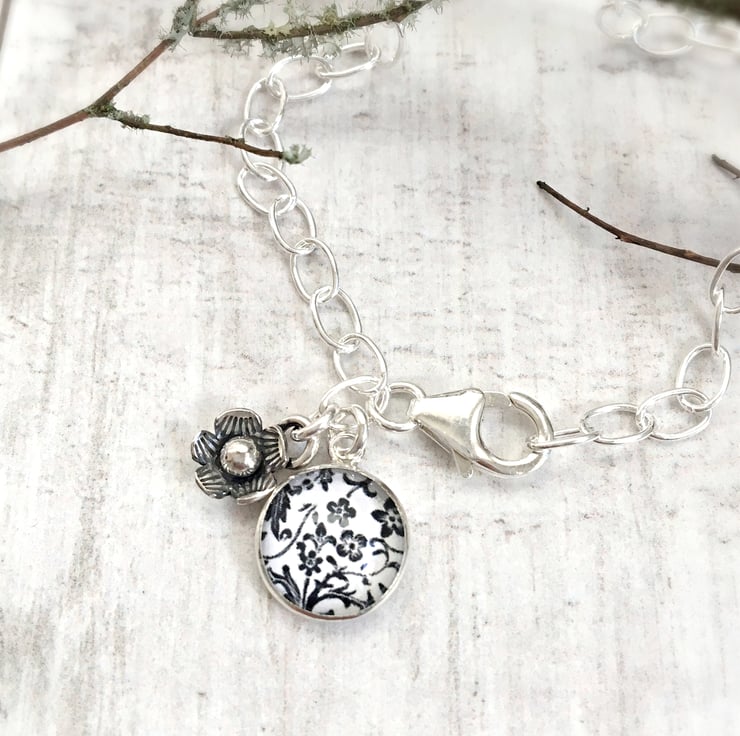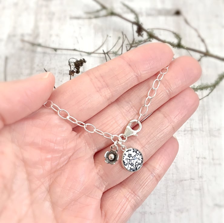 Part of my floral collection, this bracelet features an art charm made using a print of my original black ink illustration and a handmade silver flower charm.
