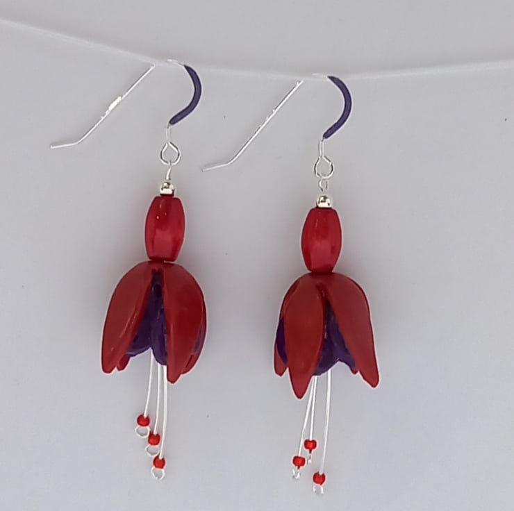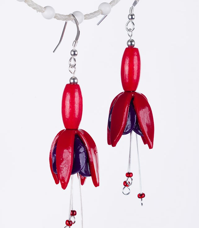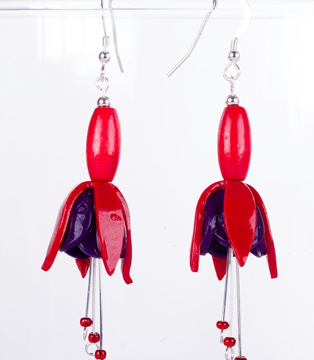 Two layers of polymer clay forming the sepals and petals, topped with an oval wooden bead. Small oval beads are now used on the red/purple design, making them slightly shorter than the other colours. Sterling silver ear hook, spacer bead, and silver plated wires. Supplied boxed