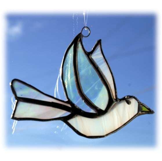 The dove is made from very streaky white glass with some iridescent to give it movement and make it shine in the light.