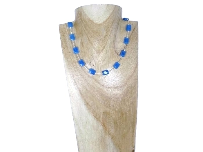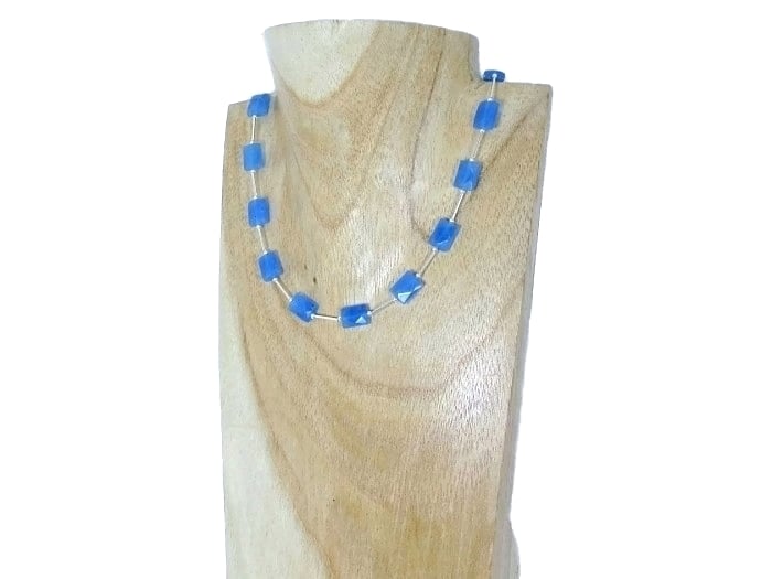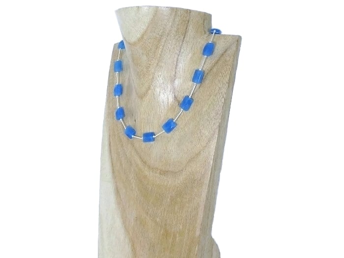 This stunning, handmade necklace features beautiful Blue Jade 11mm x 8mm faceted oblong beads with Sterling Silver beads & tubes in between.