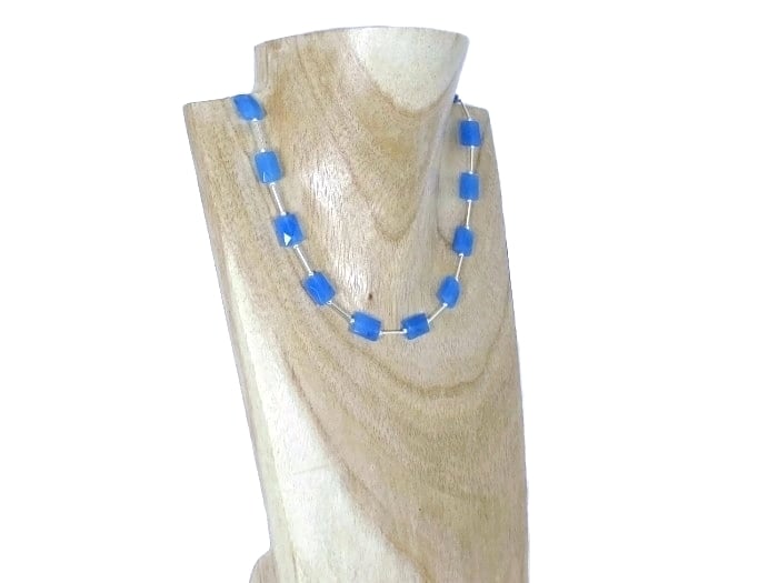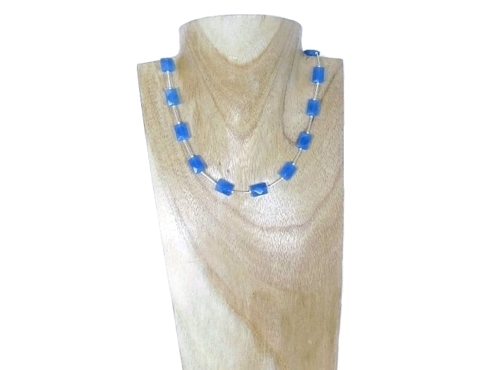 This stunning, handmade necklace features beautiful Blue Jade 11mm x 8mm faceted oblong beads with Sterling Silver beads & tubes in between.