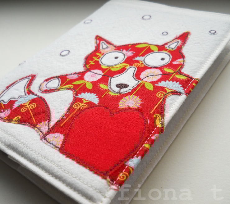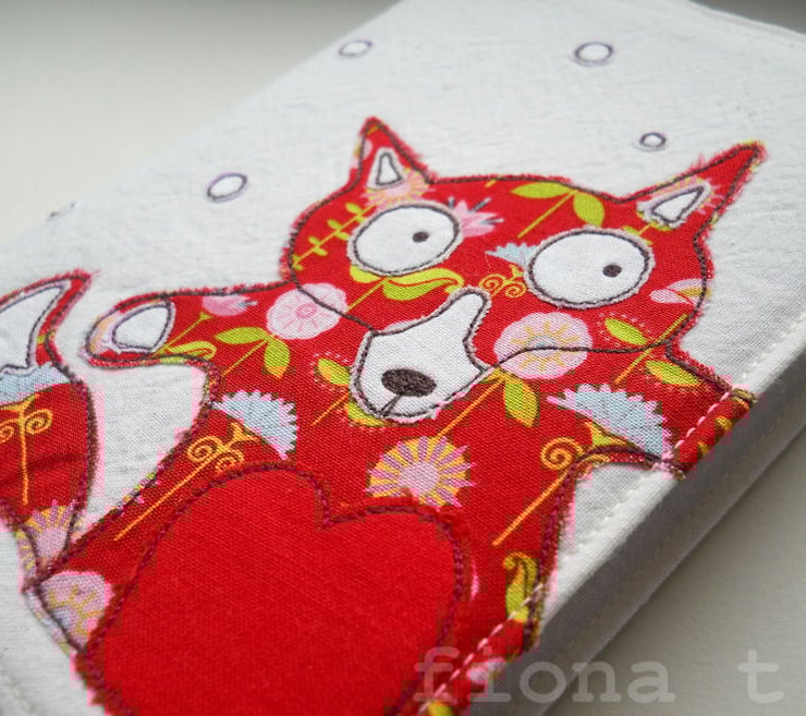 this worried looking fox is in a bright red floral printed fabric with white cotton nose, toes and tail detail. he has a red cotton heart on his tummy.