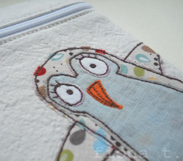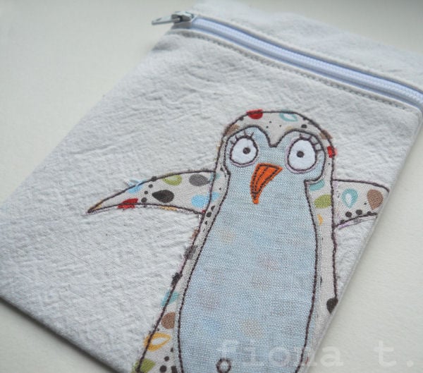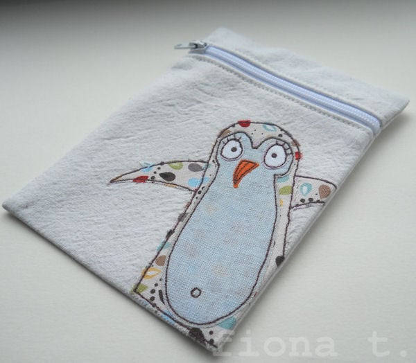 it features a confused looking little penguin in printed cottons and pale blue. the fabrics are layered and appliqued onto pre-washed calico, with the details drawn on with free machine (free motion) embroidery. i then make up the finished item.