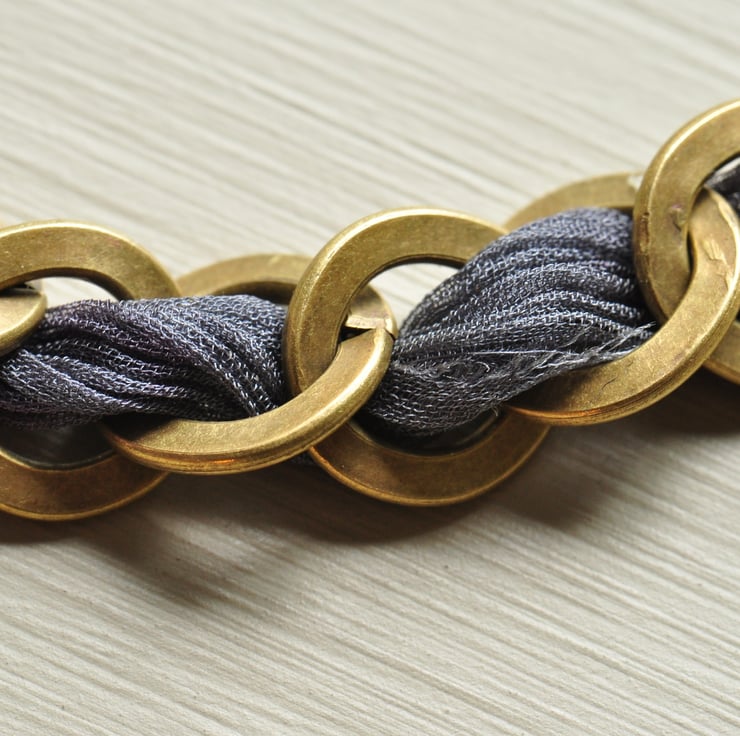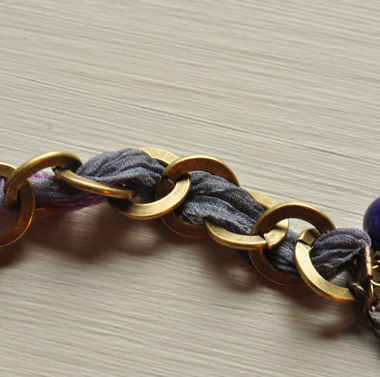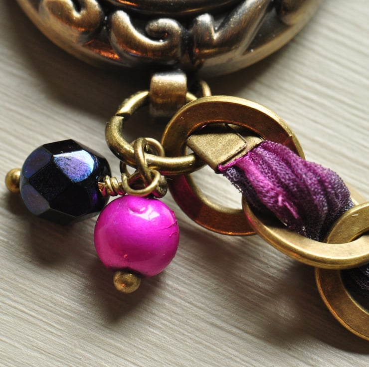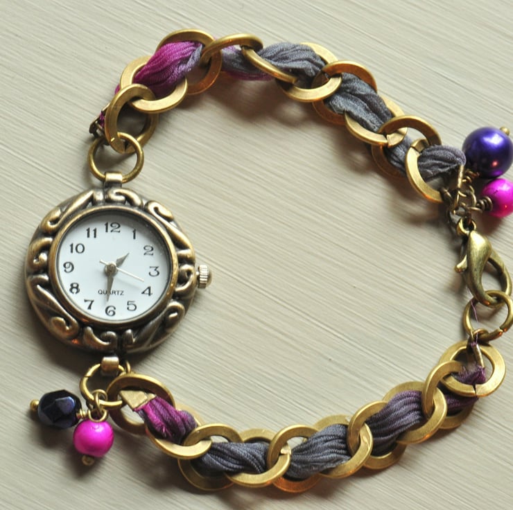 Lovely decorative round antique bronze plated watch face with chunky antique bronze plated chain with chiffon ribbon wound through in shades of cerise pink through to deep purple, finished with a trigger clasp with dangles of cerise textured pearls and purple pearl and firepolished faceted Czech bead.