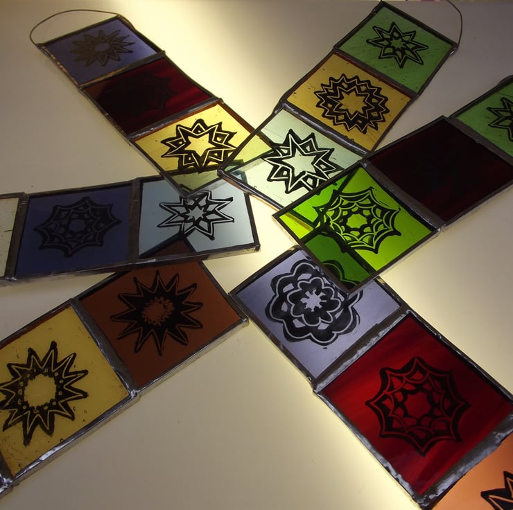 Gorgeous contemporary stained glass window hangings, painted with intricate star patterns in a range of vibrant coloured glass. Made using the copper foil technique and kiln fired stained glass paints. They would make an excellent stocking filler or stylish Christmas decoration for a winter window. Integral wire loop for hanging, If you have a specific colourway please message me your requirements, I am frequently making small batches of them at the moment.