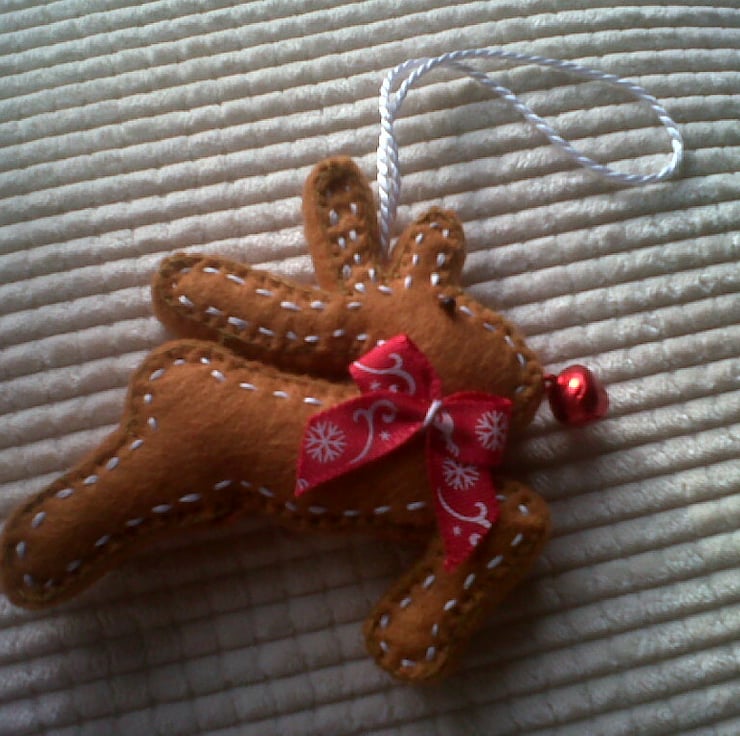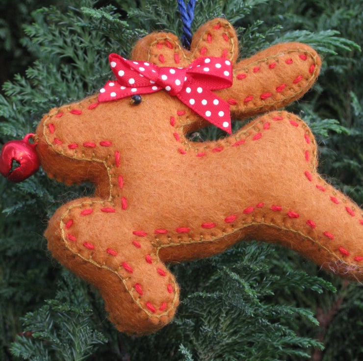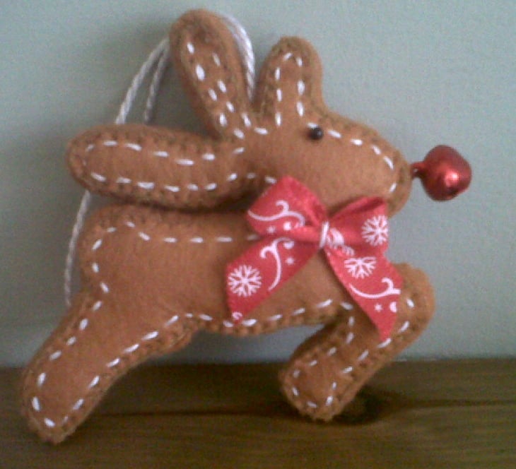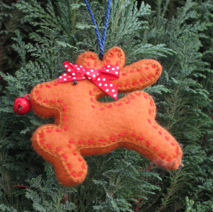 Fresh out of the Felttopia 'oven' is this gorgeous reindeer. Hand stitched and lightly padded to make him extra scrumptious he is decorated with white 'icing', a festive bow tie and has a sleigh bell for a nose so that even on the foggiest of December evenings this reindeer won't get lost!