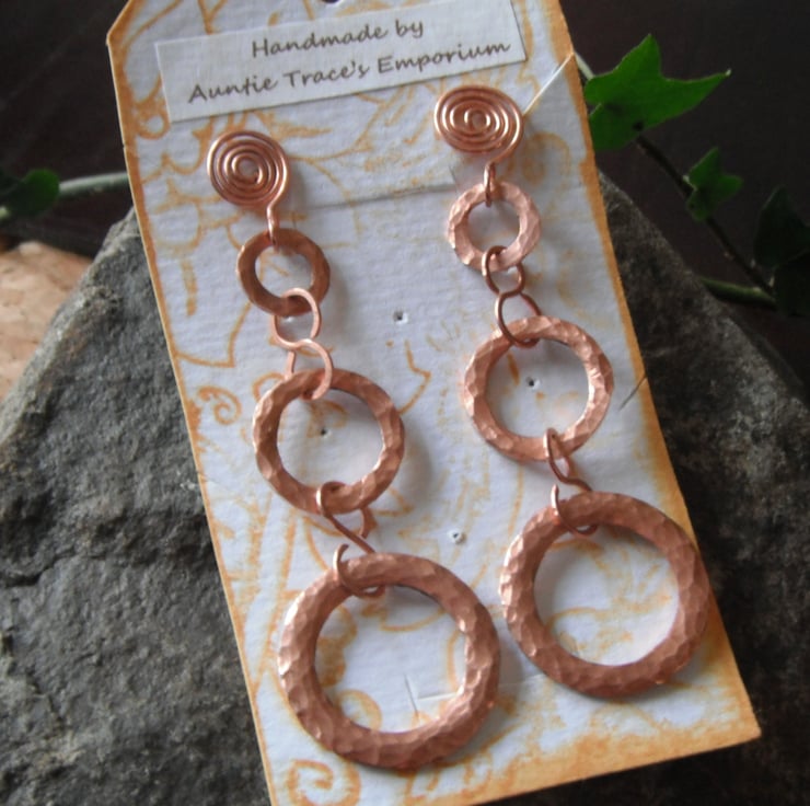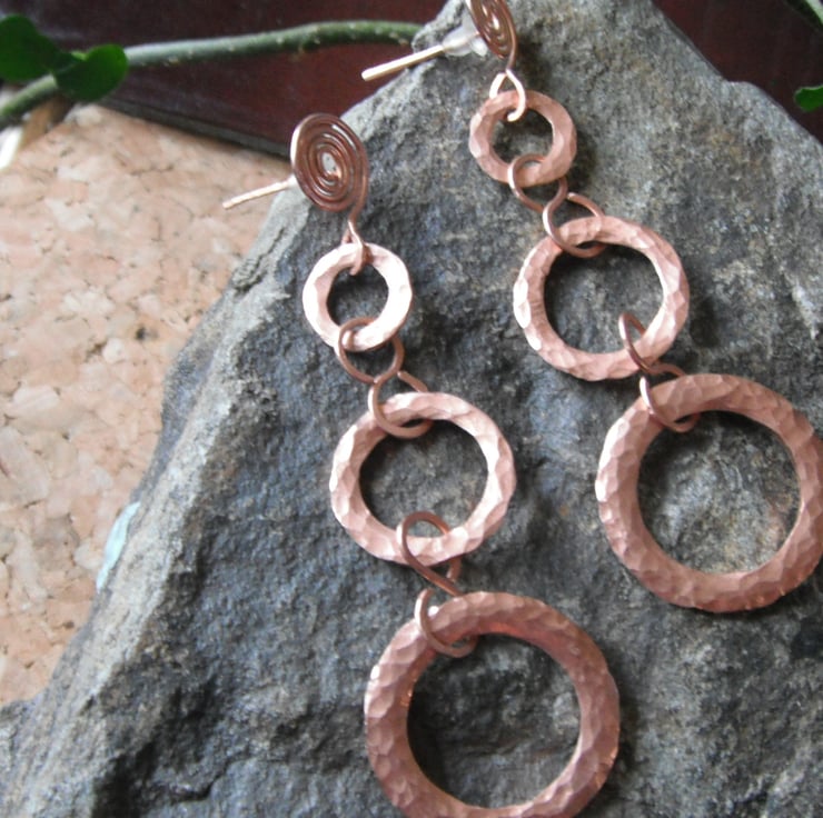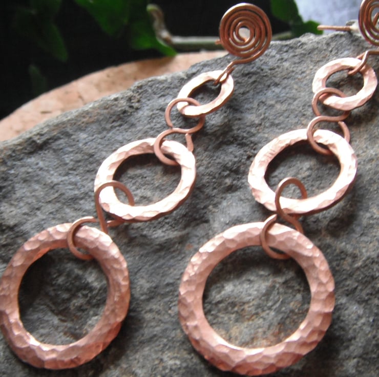 Hammered circles of copper, interconnected with hand forged figure of eight jump rings. Suspended from hand forged spiral coil stud fastenings.