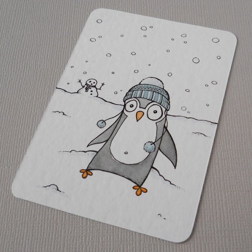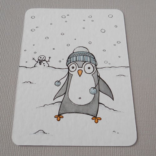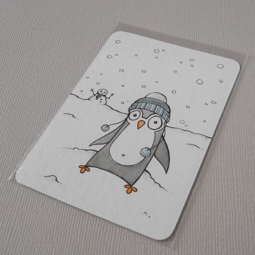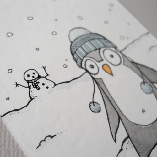 a little penguin all ready for winter in his wooly hat. he is disappointed he could not find a nice pair of mittens to match. the snowman is disappointed because he has a rather cold head!