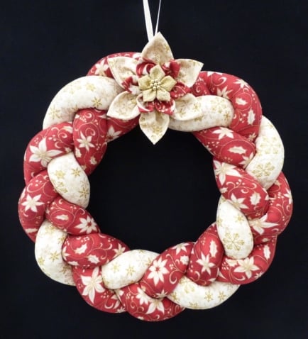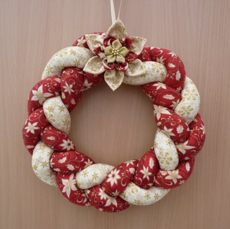 This Plaited Wreath is made up of 3 separate tubes of Red, Cream and Gold contrasting material which is filled with toy wadding. Its plaited together carefully and makes a great decoration. A contrasting flower has been added. This can be hung almost anywhere in the home. It will make a great gift for someone at Christmas time.