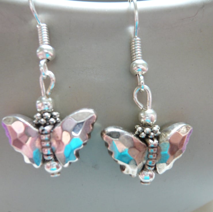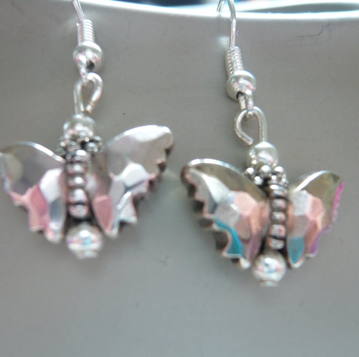 These cute little butterflies measure approx 16mm x 10 mm. They hang from silver plated ear hooks.