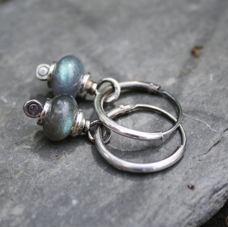 Teal flash labradorite beads have been combined with oxidised silver to make these eye catching earrings.