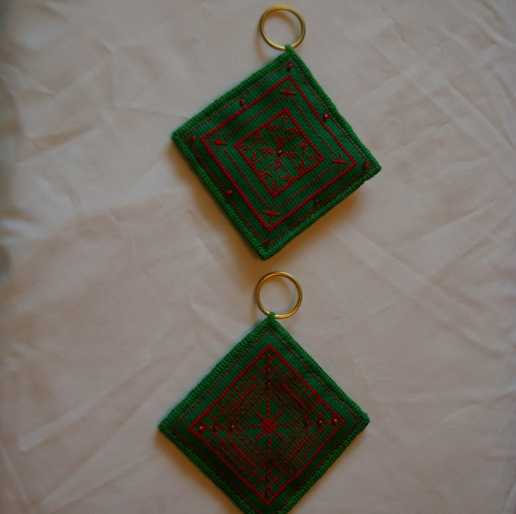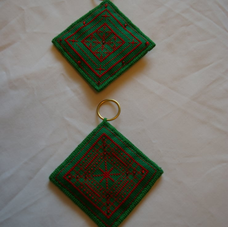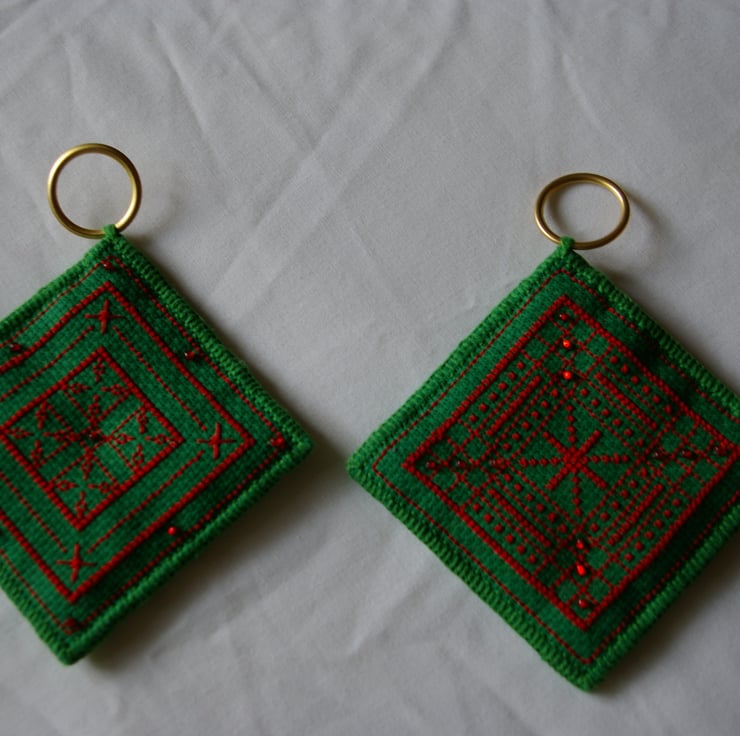 Two Cross stitch Christmas decorations. The same design is on both sides of the decoration. Hand stitched with red rayon threads onto green cotton aida. I have used red beads as added adornments. Both decorations are lightly padded and have a brass ring to hang them up by.