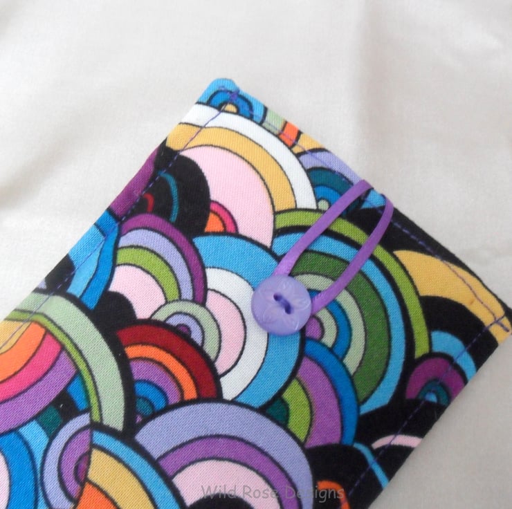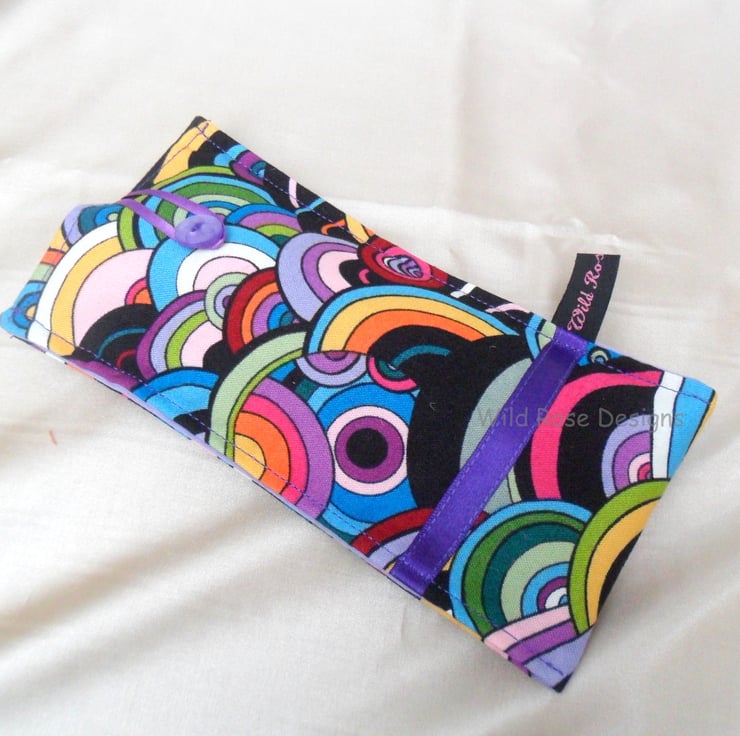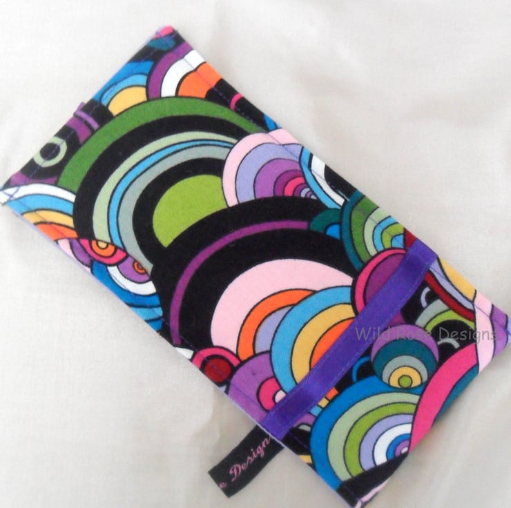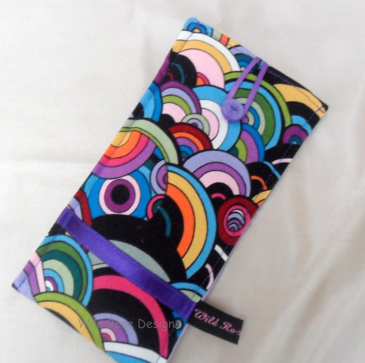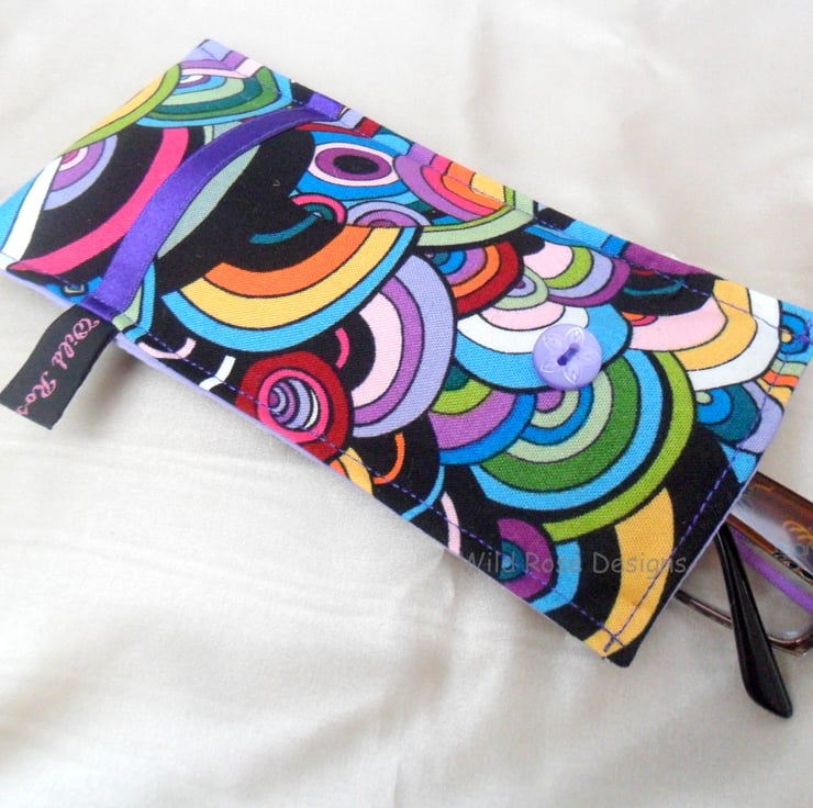 A handmade glasses case in a fabulous Sixties style cotton print fabric. It is trimmed with a narrow purple satin ribbon and closes with a loop and button. The lining is a lilac cotton and it is lightly padded to protect your specs.