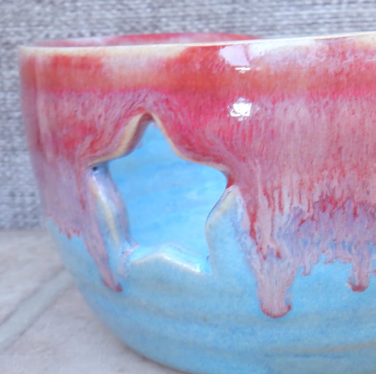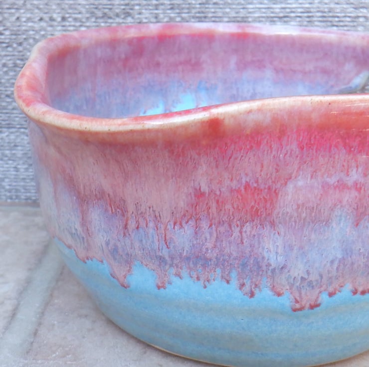 Hand thrown using strong off-white stoneware clay, and finished in a pretty light turquoise aquamarine glaze, with a runny pink reactive glaze over the top.