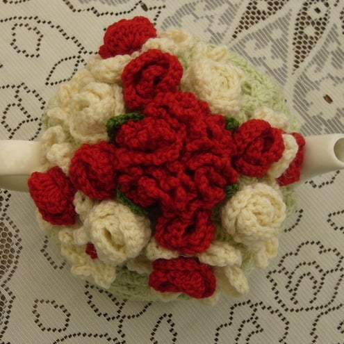 The cosy has been handmade using good quality yarn in a lovely pale green colour. The top of the cosy is decorated with a large crochet carnation in bright red with four green leaves. Around the edge of the carnation are four individual small red roses and four cream roses. There are four large cream flowers with small red rose centres and in between the large cream flowers are very pretty little flowers in cream with red crochet bobble centres.