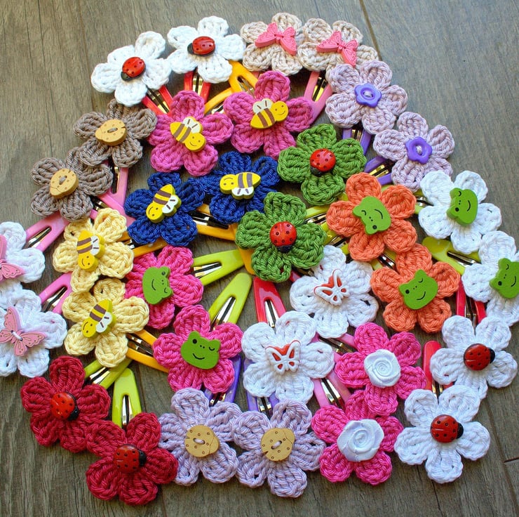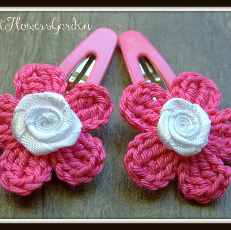 A pair of handmade, gorgeous hair clips with crochet, cotton flowers in baby pink.