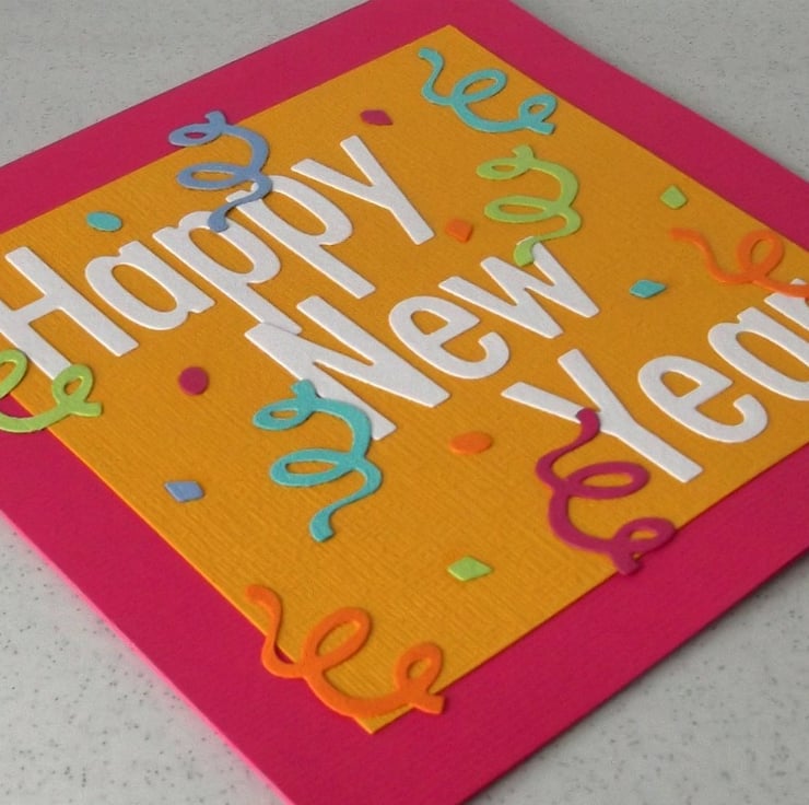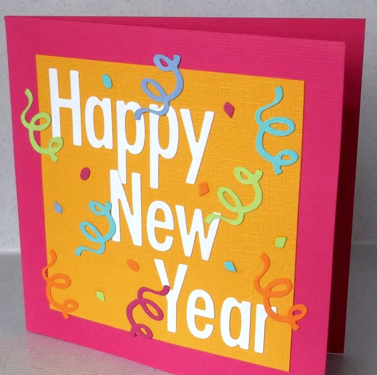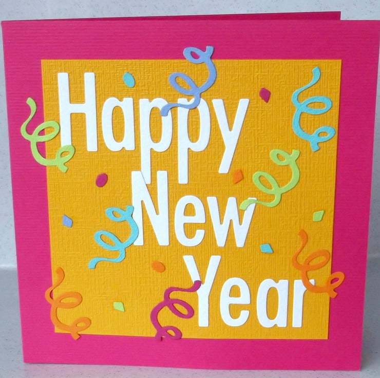 A bright and modern Happy New Year card with die cut letters and decoration mounted on a textured yellow background, mounted on a bright pink base. An original, distinctive handmade greetings card to celebrate the holiday season.