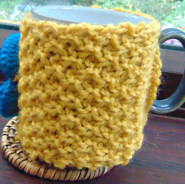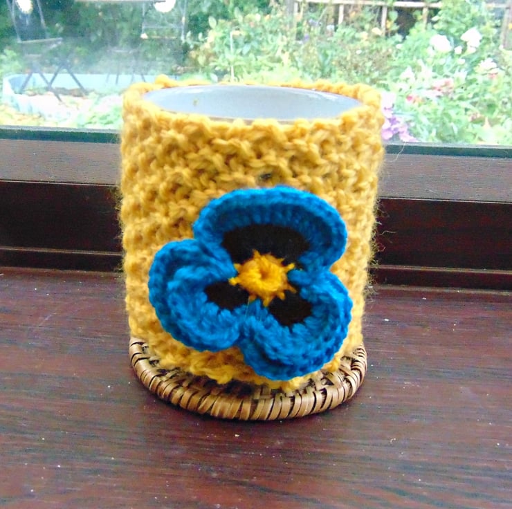 Hand Knitted Mug Cosy in lovely yellow wool yarn embellished with a turquoise pansy