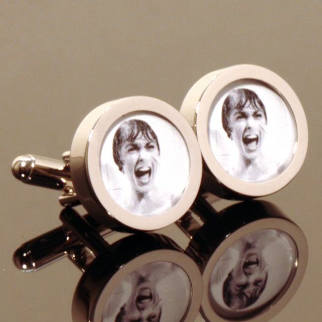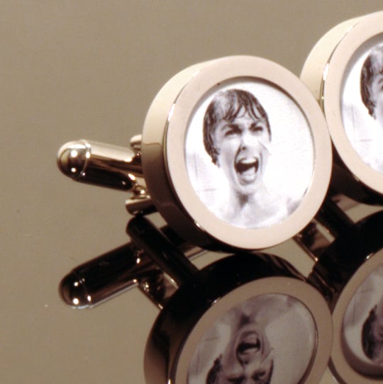 Janet Leigh of Psycho fame features in these gruesome Psycho cufflinks, perfect Halloween cufflinks or movie cufflinks just for fun. This black and white image is from the scene where she gets murdered at the start of the movie! A friend of mine upcycled her white shower curtain and covered it in bloody handprints in red paint, and it gave me the inspiration to make these cufflinks!