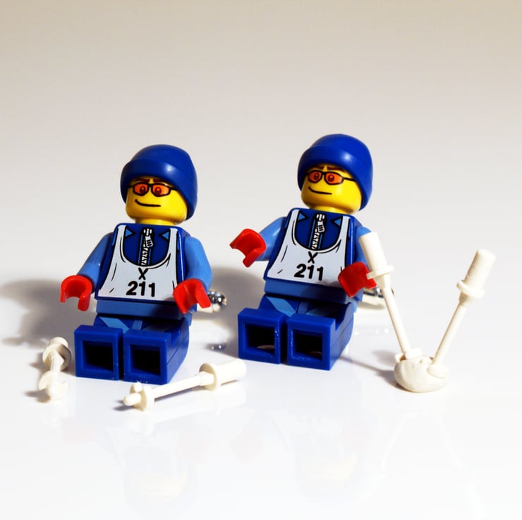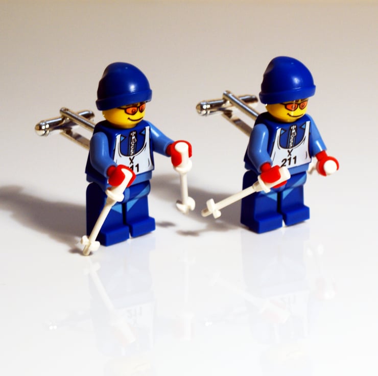 Skier cufflinks made from LEGO® skiing figures dressed in blue, complete with snow poles (because we're never too old to play with LEGO®). For snow fans everywhere and for something a little bit different, these ski cufflinks are a fun reminder of winter holidays.