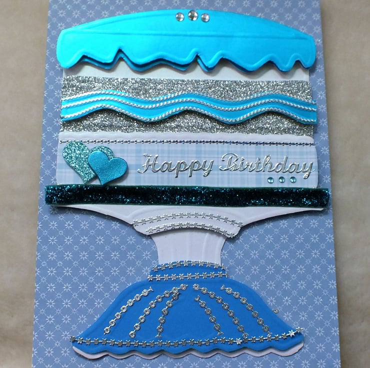 Stunning effect, handmade, embossed and layered birthday cake card. Embellished with an assortment of premium quality papers and card, faux gem stones, peel-offs, brads, ribbons and flowers. Includes 'Happy Birthday' sentiment inside. N.B. Designs and colour schemes vary - but this listing is for x1 card as per the photo shown here. For alternative cake designs please follow the link to the main Boadicea Cards page, and select the Birthday shop section.