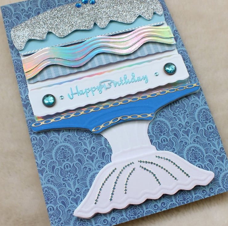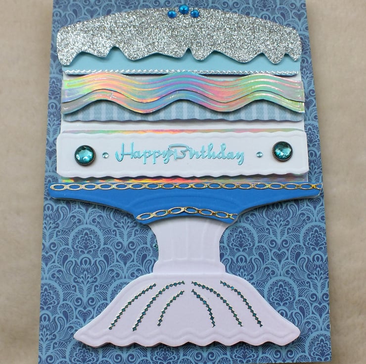 Stunning effect, handmade, embossed and layered birthday cake card. Embellished with an assortment of premium quality papers and card, faux gem stones, peel-offs, brads, ribbons and flowers. Includes 'Happy Birthday' sentiment inside. N.B. Designs and colour schemes vary - but this listing is for x1 card as per the photo shown here. For alternative cake designs please follow the link to the main Boadicea Cards page, and select the Birthday shop section.