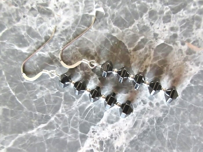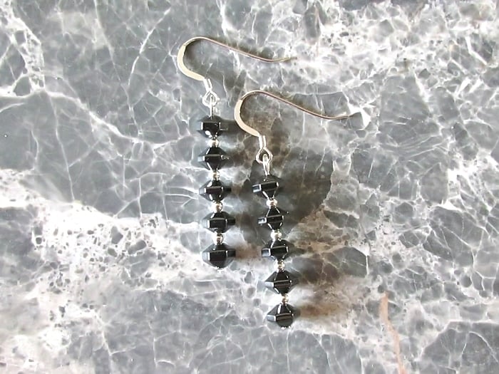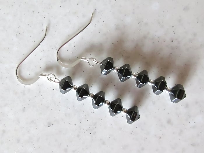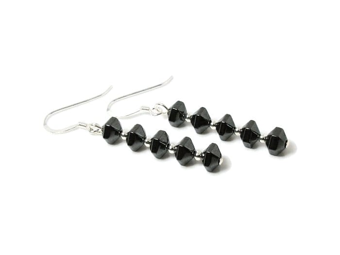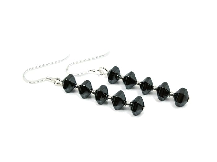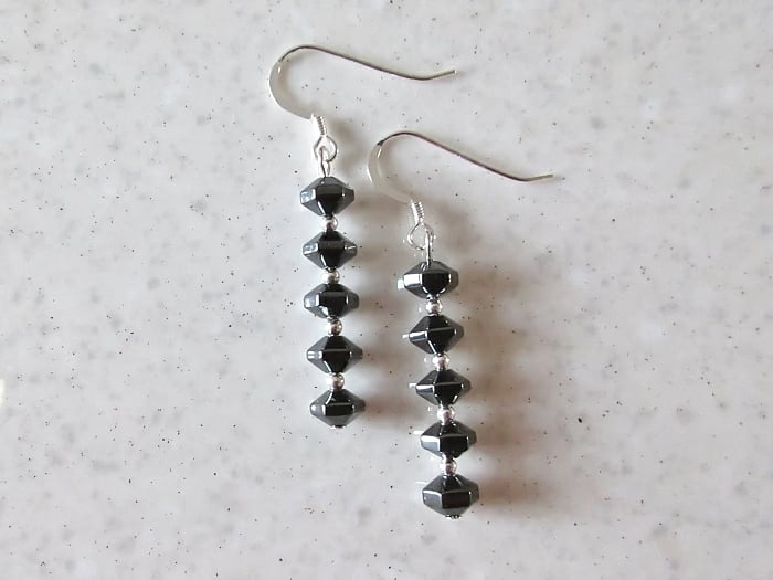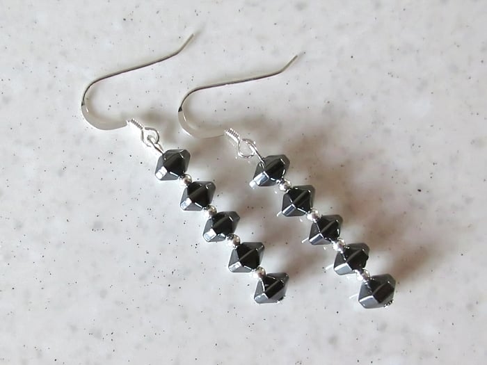 These easy to wear, hand crafted dark grey black earrings have been designed using faceted 6mm Hematite bicone shaped beads with Sterling Silver beads in between.