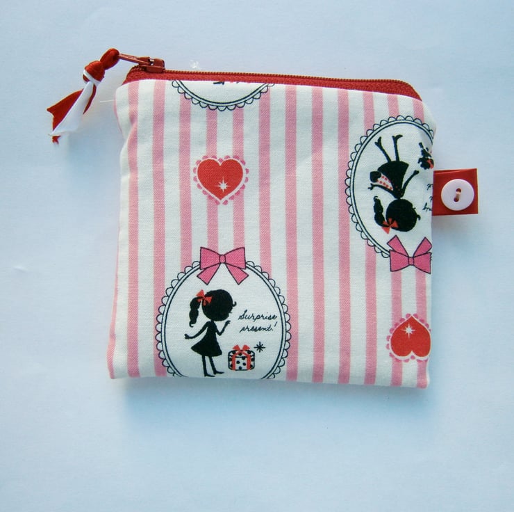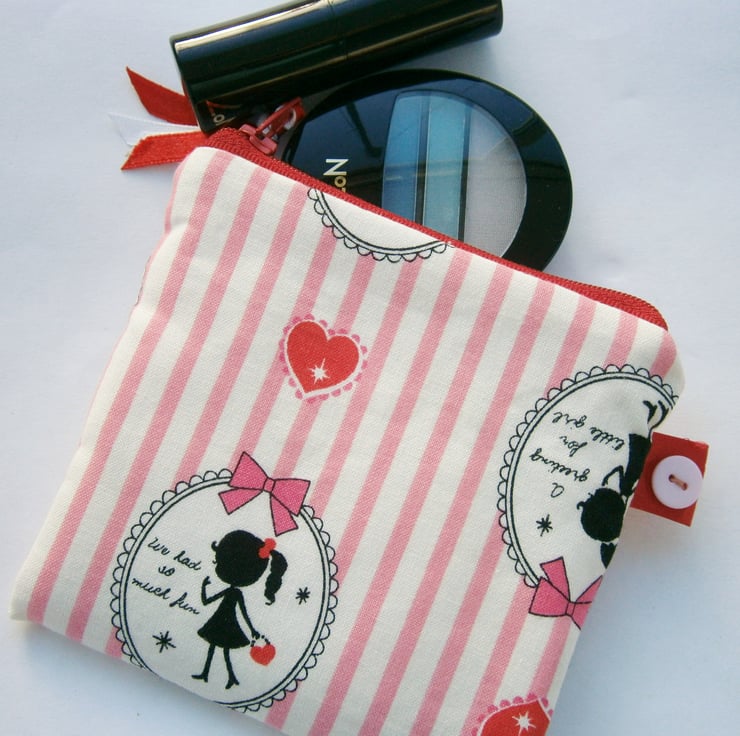 Pretty little striped pink fabric coin purse, perfect for your coins, notes and cards.