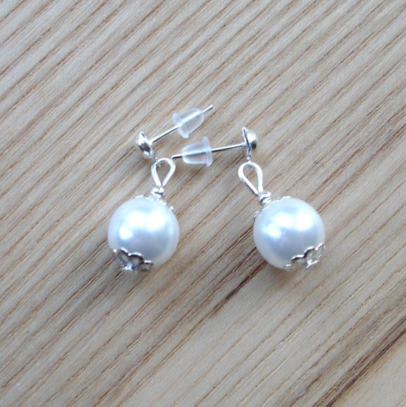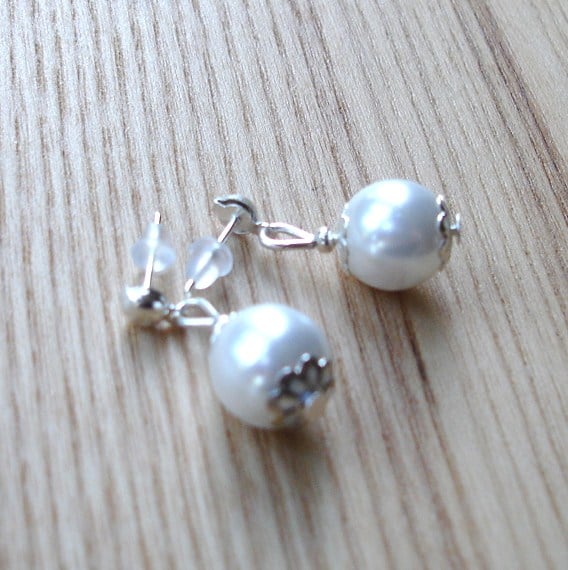 These drops are really chic! They feature some white glass pearl beads which are combined with a silver plated spacer bead and bead caps, all finished off with silver plated studs. The studs have plastic bullet backs for comfort. Great for everyday wear, with a drop length of 1.8cm.