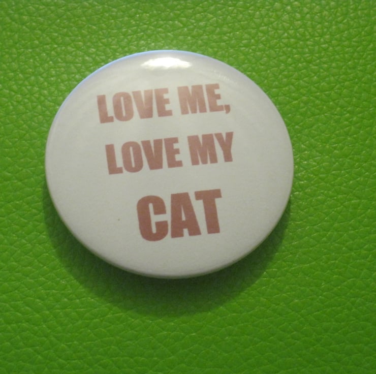 A badge with the text 'Love Me, Love My Cat' in red on a white background.
