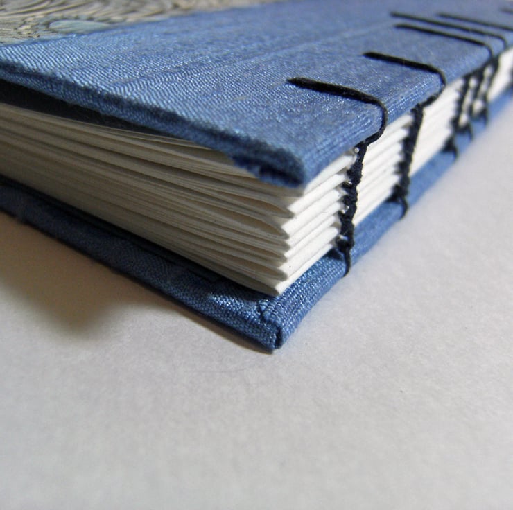 The book has a Coptic binding, with seven rows of deep blue waxed linen thread, with a decorative pattern on the book covers. The book opens flat throughout.