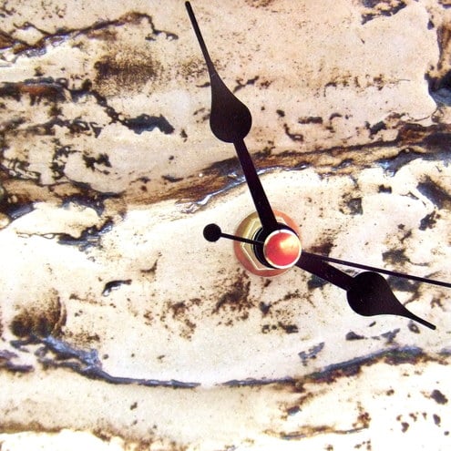 This handmade ceramic clock has an impressed tree bark pattern on the surface, coloured in cream and brown. The corner of this clock is 'missing', creating an individual look and adding to its features.