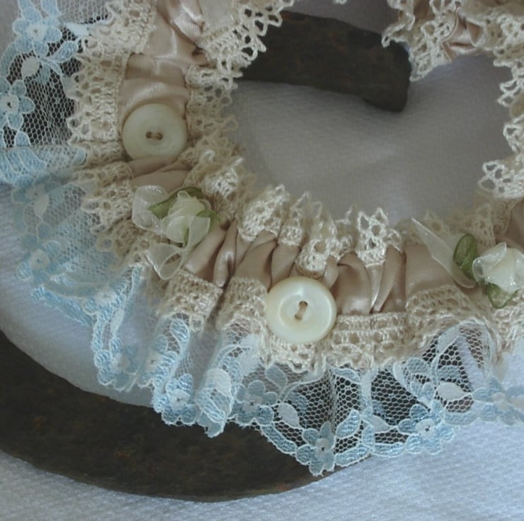 My daughter makes this lovely shabby chic, vintage styled, wedding garter to order.