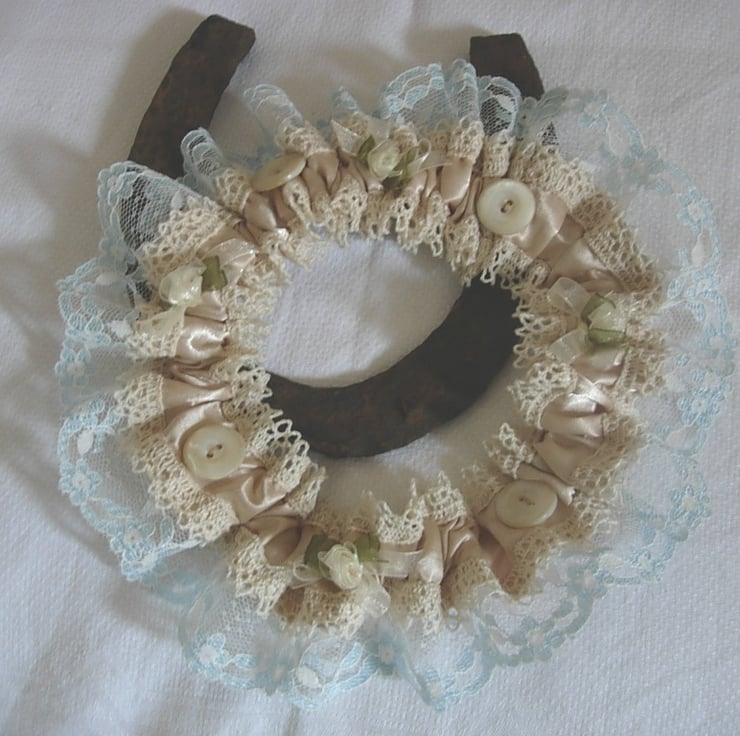 My daughter became inspired to 'get creative' whilst I was working on a vintage crochet Wedding Dress. This was one of the garters she has created!