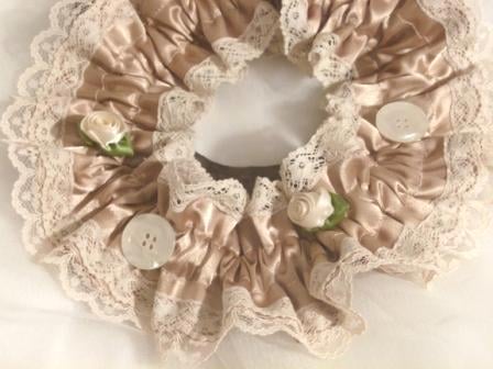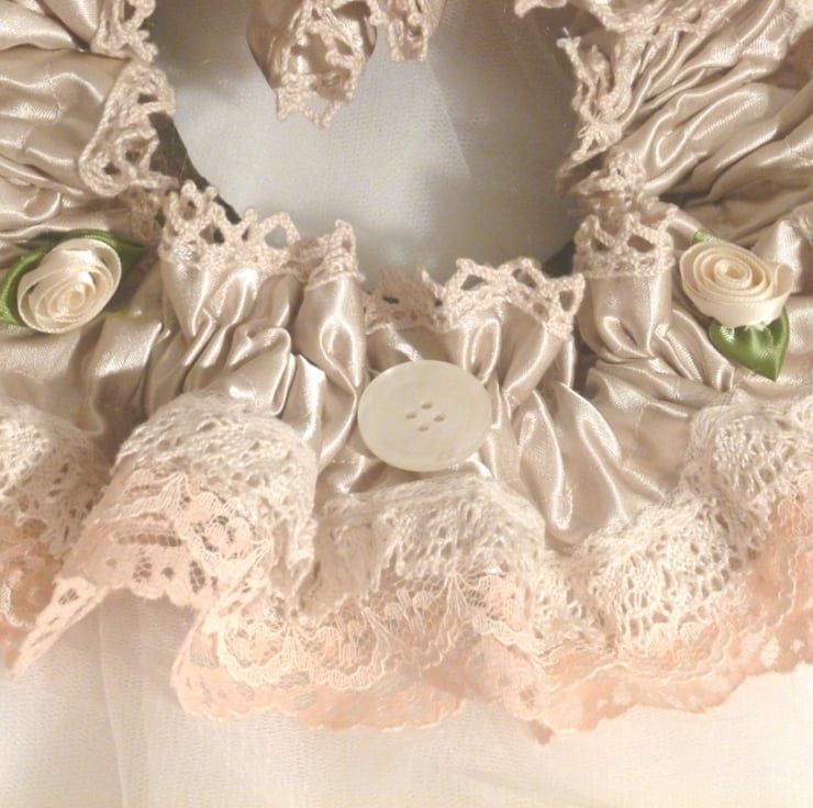 'Victoriana' is made from a silky soft , elasticated satin backing band so that it feels nice against the leg. This is trimmed along the lower edge with a Scalloped Polyester Raschel Lace (shown here in Pale Peach). Top and bottom of the garter are also trimmed with a vintage crocheted cotton lace (shown in ecru/taupe). 'Victoriana' garter is then trimmed with pretty Mother of Pearl buttons, giving it that 'shabby chic' look and (optional) dainty chiffon, handmade ribbon bows and flowers!