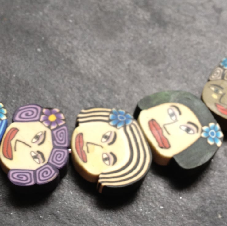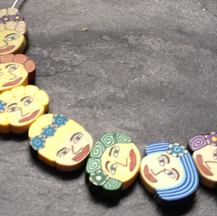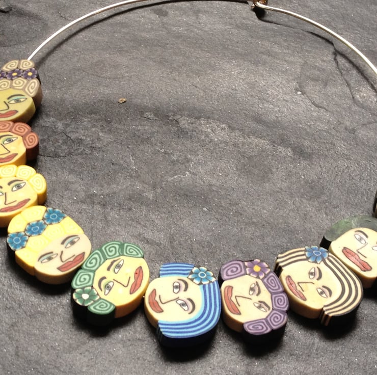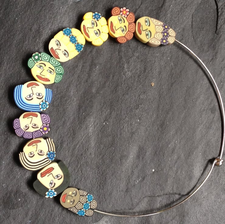 Part of the Kitsch Creations premier Silver Edition collection, this design features a rainbow ordered series of large 25-31mm polymer clay ladies' faces beads threaded onto a high quality rigid ball end fastening silver plated choker. The detail on these beads is truly remarkable and this fun and vibrant design is bound to be a great conversational piece. To prevent "upside down heads" the direction of the faces is reversed in the centre of the choker.