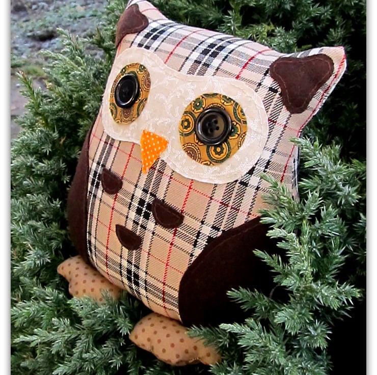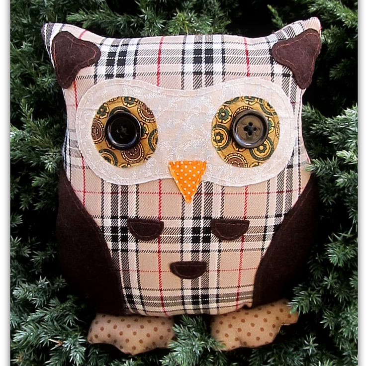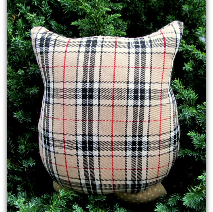 Henry is a small owl cushion. Resplendent in tartan, he stands 23cm tall on his plump, polka dot feet.
