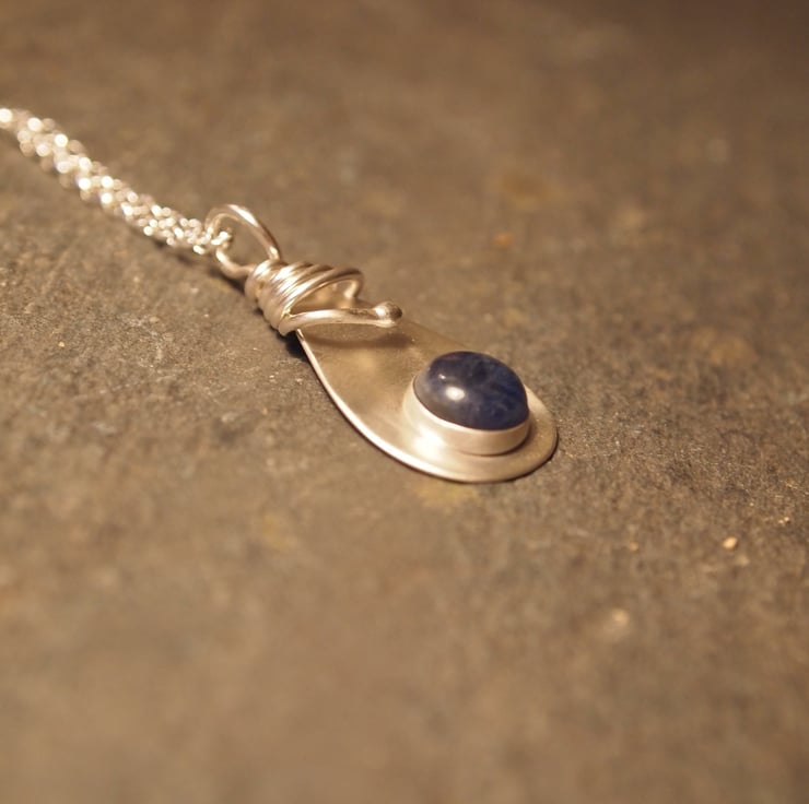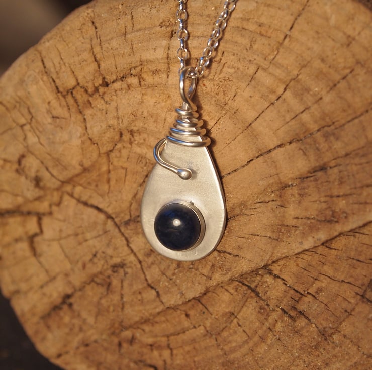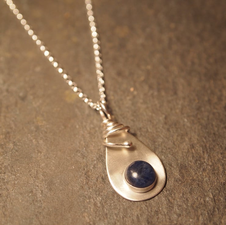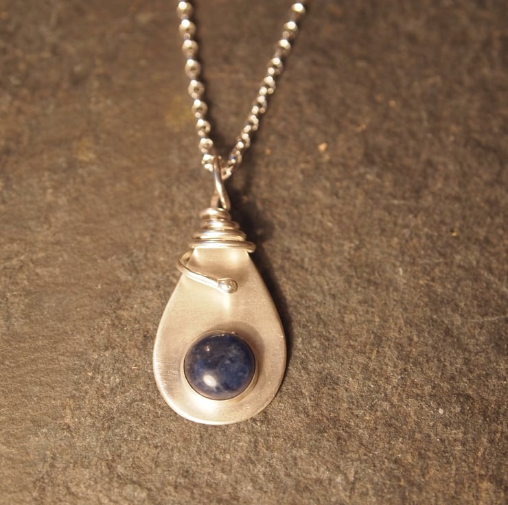 This droplet shaped pendant has a length of silver wrapped around the top and a lovely deep blue sodalite stone flashed with lighter blue and grey. The wrapped silver also forms a ring from which the pendant hangs. This one is on an 18" belcher chain - 16" is also available please state your preference when ordering. The pendant is finished with a matt/satin finish.