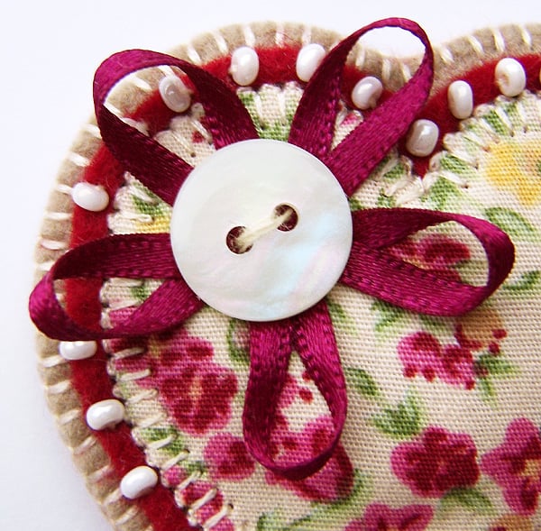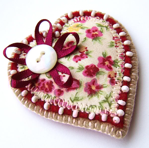 It features an appliqued heart design in beautiful cotton floral print fabric. It is mounted onto a deep red felt base and edged with pretty cream seed beads. The heart is finished with a ribbon and button flower detail in coordinating colours. It is mounted onto a light mink brown felt base and has a brooch backing for easy attachment.