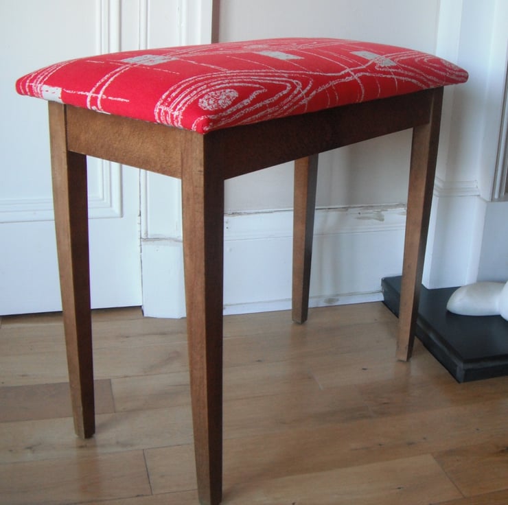 This is a vintage piano stool that has been fully re-upholstered using a combination of 2 beautiful original 1950s fabrics. The very simple design of the structure of this piece of furniture is in stark contrast with the very bright and contrasting fabrics we have chosen for its re-upholstery. The outside is upholstery is a bright red and white abstract pattern, reminiscent of tree rings. The top of the stool lifts up uncovering a padded interior upholstered all over with a beautiful satin cotton material with very abstract motives in black, grey and white.