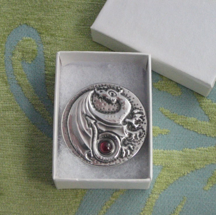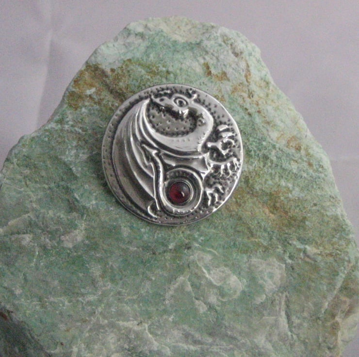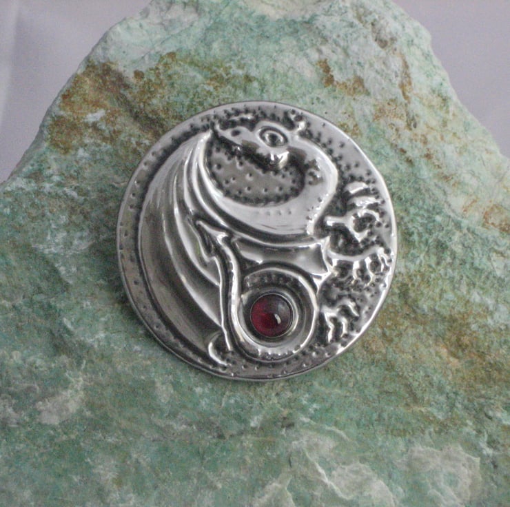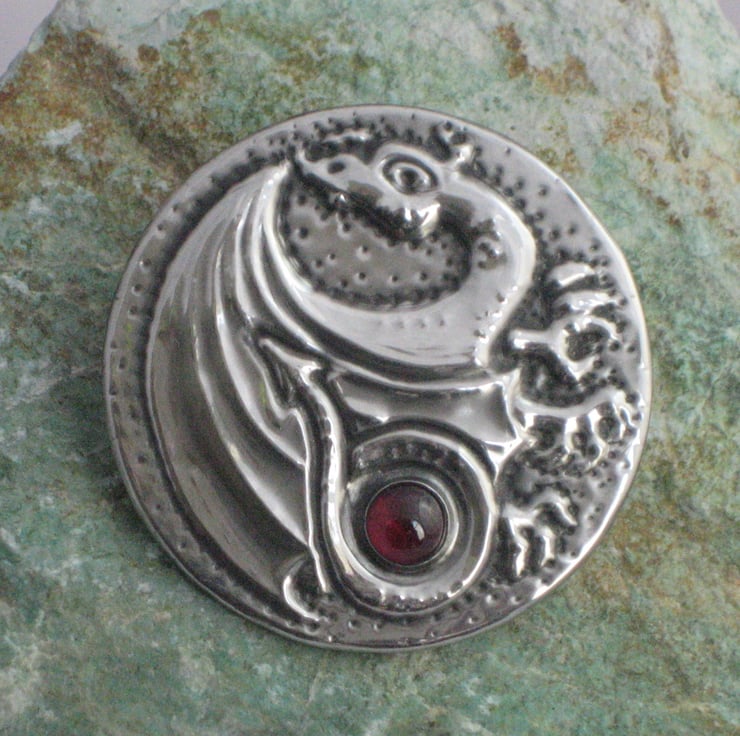 This brooch has been hand-made in pewter and feature a genuine garnet cabochon.It measures 40mm,1.5 ins across and has a 25mm,1 pin with safety catch on the reverse. Comes gift boxed.