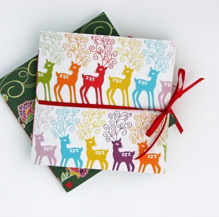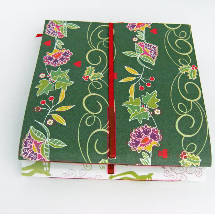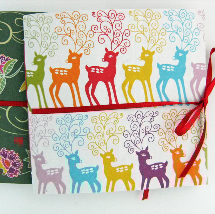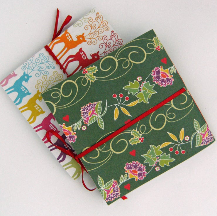 A pair of sweet little square pocket notebooks, in Christmassy designs, tied with bright red ribbons.