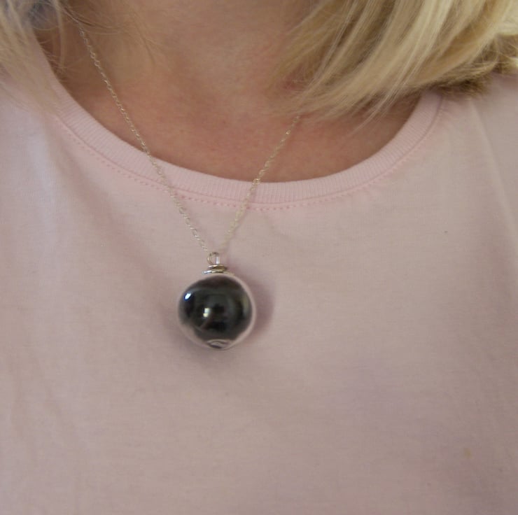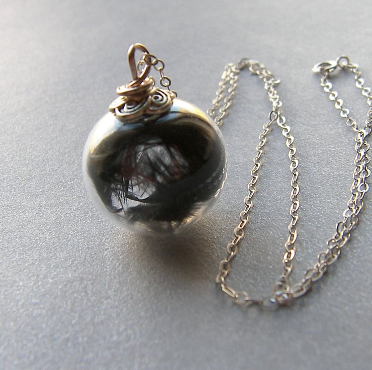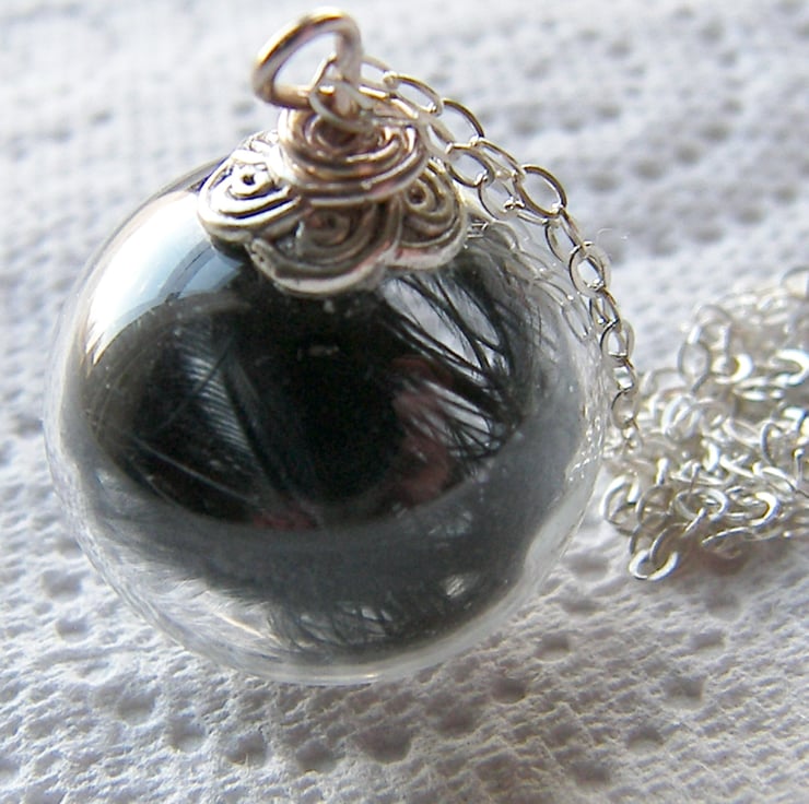 Description: I have very carefully hand filled this Beautiful hand blown glass hollow bead, measures approx 20mm x 20mm with 2 tiny soft fluffy black marabou feathers and attached vintage style cab to the top, hangs from 18" 925 sterling silver chain
