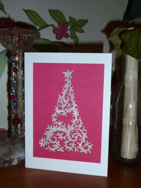 This card feature a papercut christmas tree cut out of index page from an old atlas. It shows the listing of Christmas Island in the star at the top of the tree!