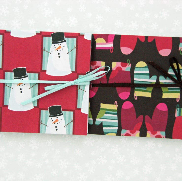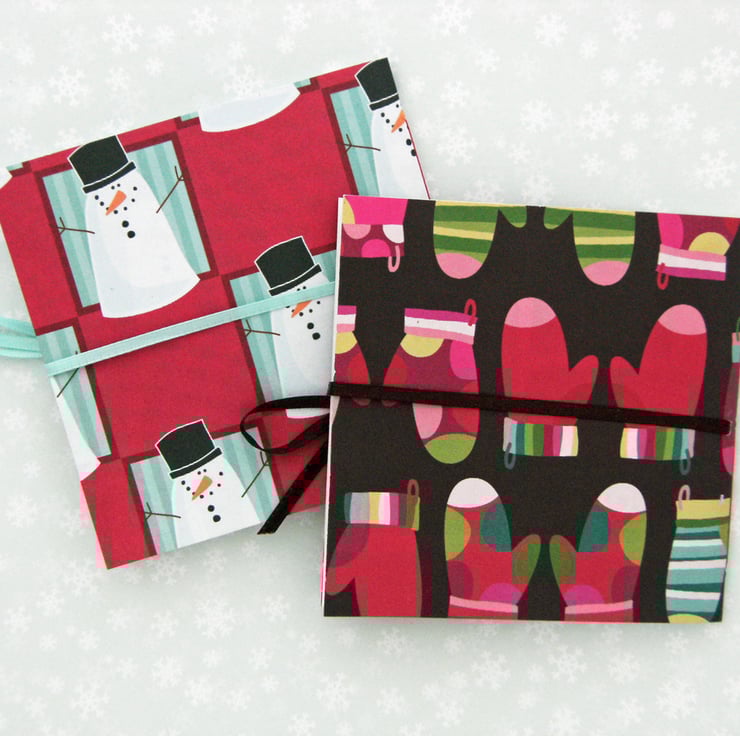 A pair of square pocket notebooks, in winter designs, tied with ribbons.