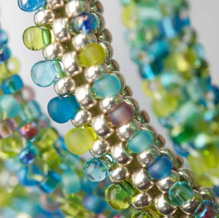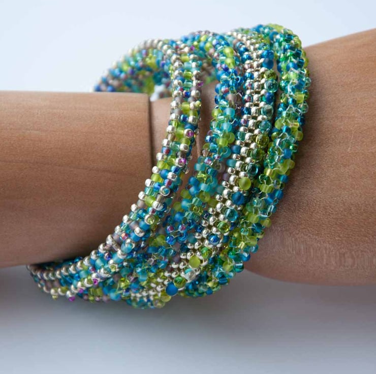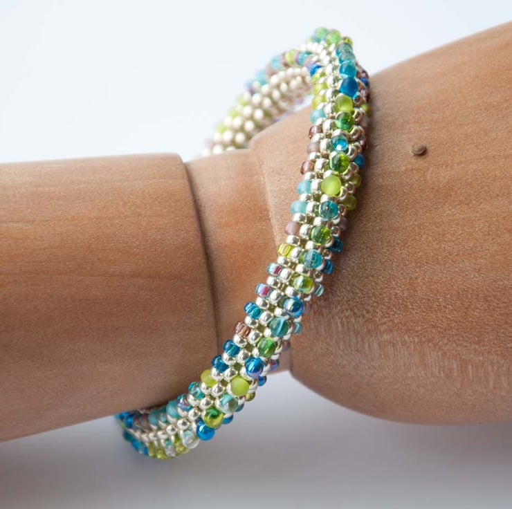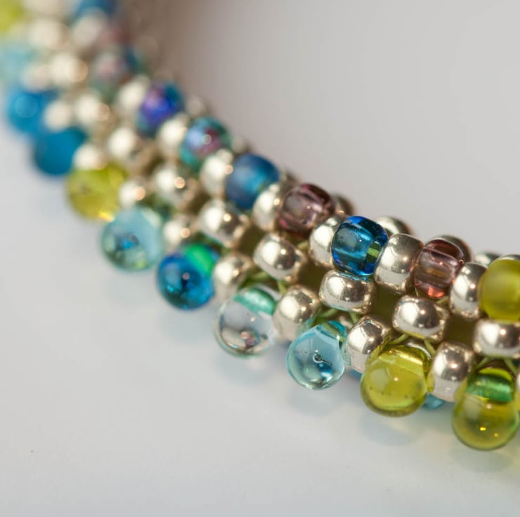 Made from hundreds of Japanese Miyuki seed beads stitched individually using embellished right angle weave. The base is covered with galvanised silver size 8 beads with an embelishment of seed beads and drops in shades of turquoise, lime and lilac in a variety of finishes. The bangle has a lime rubber core supported by a memory wire loop to maintain its shape, but it's still flexible when you're getting it on and off.