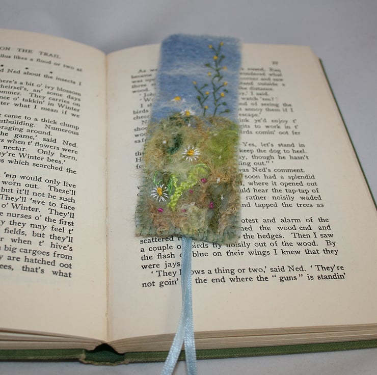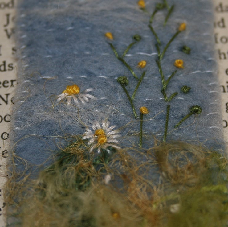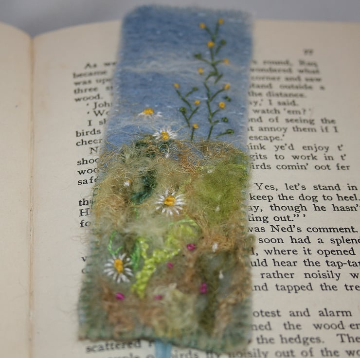 An embroidered, felted and hand-stitched Meadow design bookmark. Each felted and embroidered wildflower meadow from Lynwoodcrafts is unique in composition.