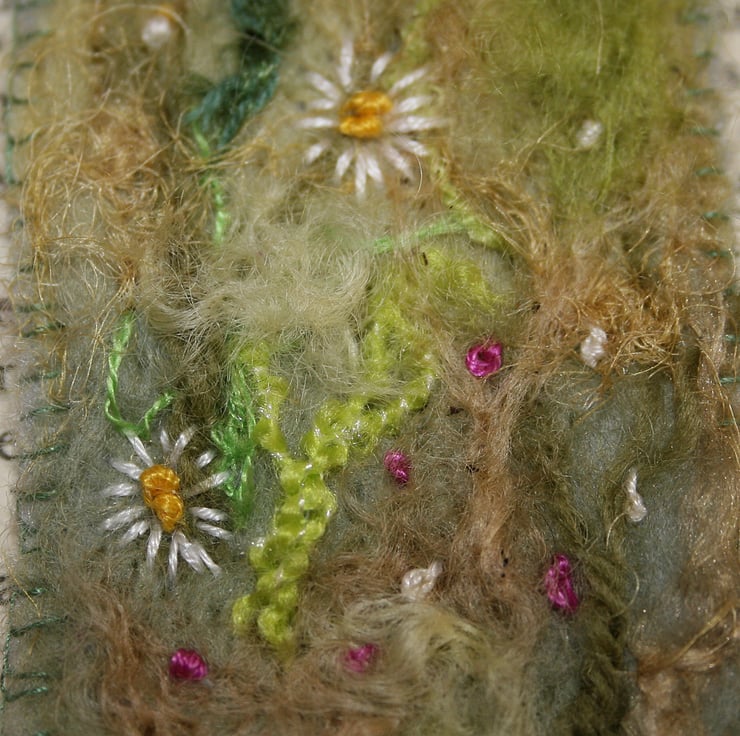 A variety of hand-dyed fibres are felted onto a kunin felt backgorund using an embellisher machine. Meadow details are added by snippets of yarna nd other fibres, carefully prserved from other projects. Distant flowers are suggested by French knots. The daisies in the foreground are stitched in detail.