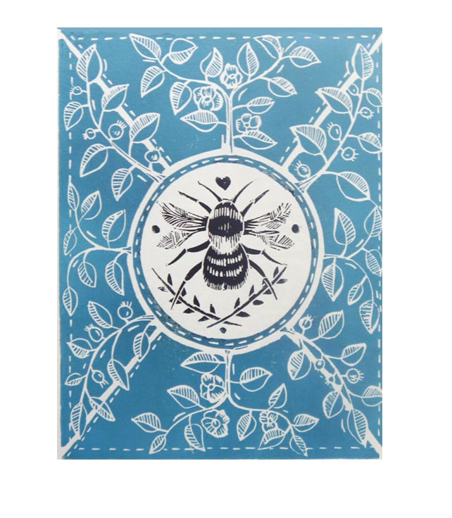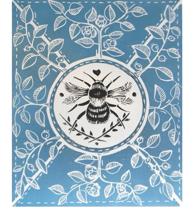 This print was inspired by a beautiful bumble bee that wandered into my studio recently. Printed on cartridge paper in pale blue and black ink.